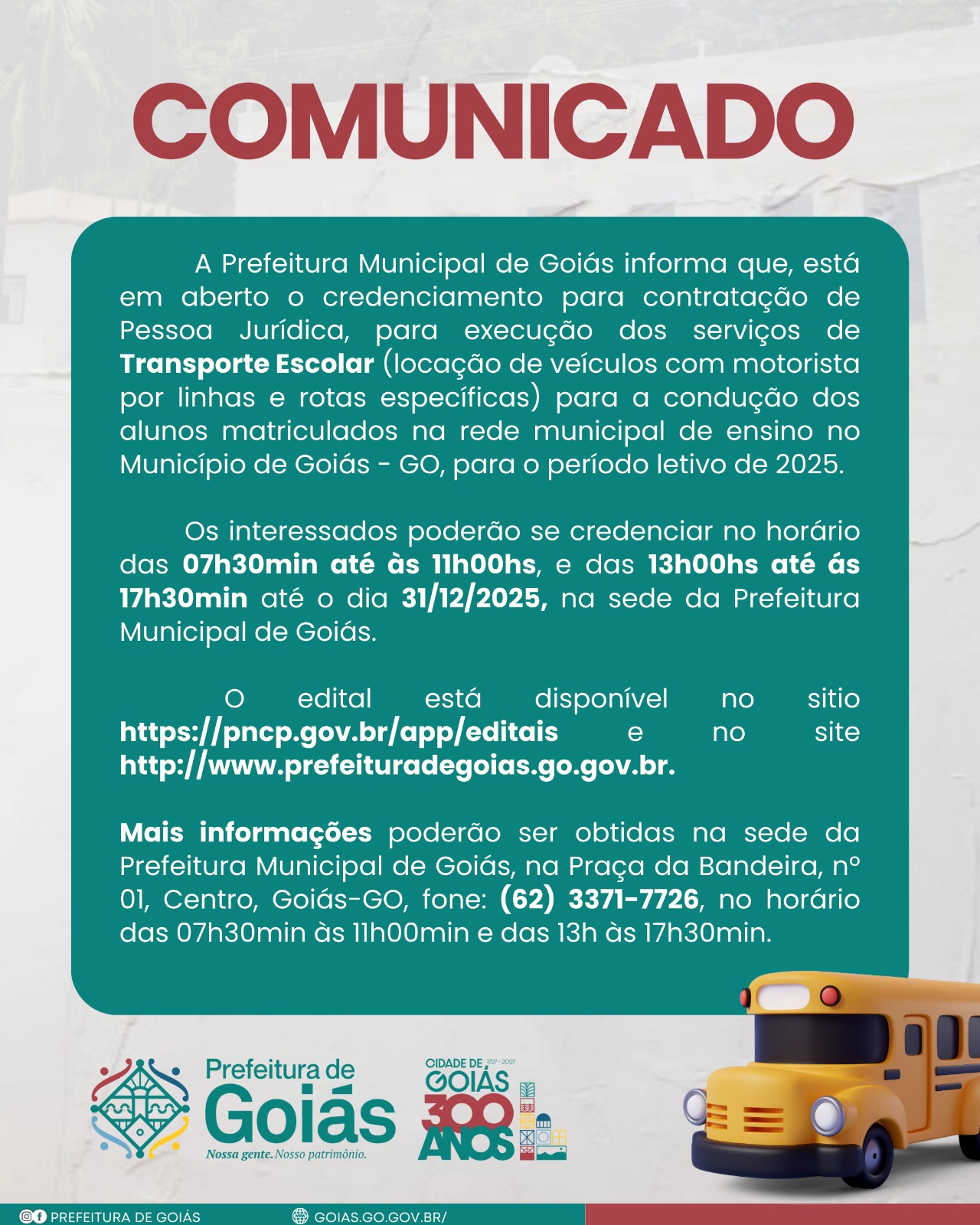 Bem-vindo ao portal oficial da Prefeitura Municipal de Goiás. Aqui você encontra serviços online, notícias atualizadas, informações sobre licitações, editais, obras, planejamento, receitas e despesas públicas, garantindo transparência e acessibilidade ao cidadão.